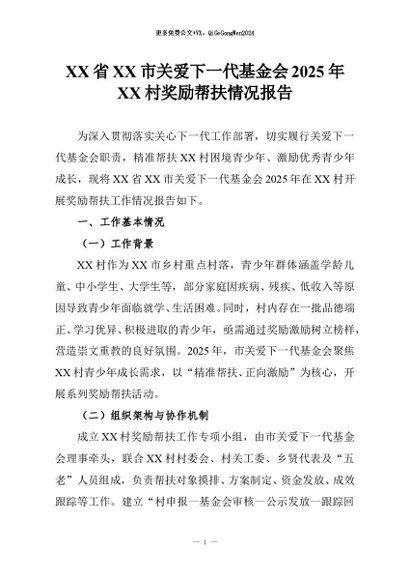 【七哥公文】2026年:XX省XX市关爱下一代基金会2025年XX村奖励帮扶情况报告+更多免费公文+VX:QiGeGongWen2024