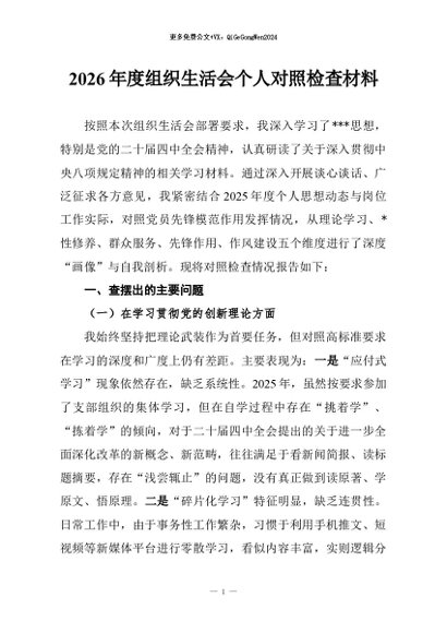 / 【七哥公文】2026年:2026年度组织生活会个人对照检查材料+更多免费公文+VX:QiGeGongWen2024