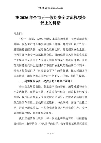/ 【七哥公文】2026年:在2026年全市五一假期安全防范视频会议上的讲话+更多免费公文+VX:QiGeGongWen2024