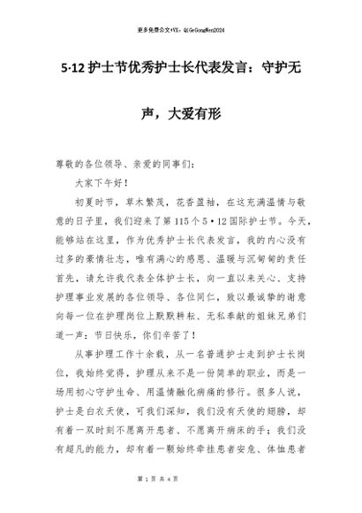 【七哥公文】2026年:5·12护士节优秀护士长代表发言:守护无声,大爱有形+更多免费公文+VX:QiGeGongWen2024