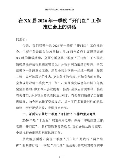 【七哥公文】2026年:在XX县2026年一季度“开门红”工作推进会上的讲话+更多免费公文+VX:QiGeGongWen2024