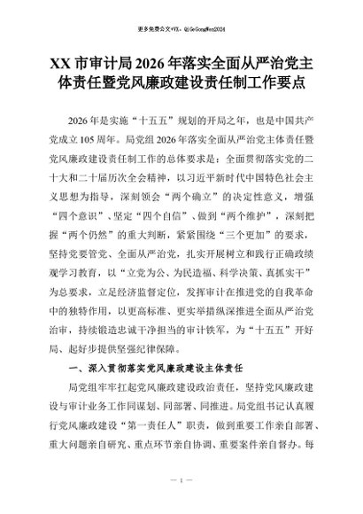 【七哥公文】2026年:XX市审计局2026年落实全面从严治党主体责任暨党风廉政建设责任制工作要点+更多免费公文+VX:QiGeGongWen2024