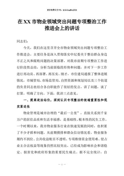 【七哥公文】2026年:在XX市物业领域突出问题专项整治工作推进会上的讲话+更多免费公文+VX:QiGeGongWen2024