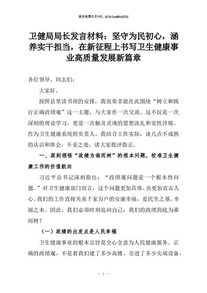 【七哥公文】2026年:卫健局局长发言材料:坚守为民初心,涵养实干担当,在新征程上书写卫生健康事业高质量发展新篇章+更多免费公文+VX:QiGeGongWen2024