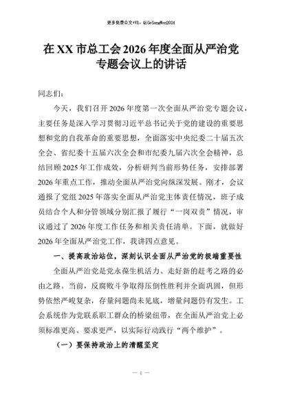 【七哥公文】2026年:在XX市总工会2026年度全面从严治党专题会议上的讲话+更多免费公文+VX:QiGeGongWen2024