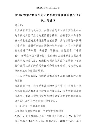 【七哥公文】2026年:在 XX 市推进新型工业化暨制造业高质量发展工作会议上的讲话_副本+更多免费公文+VX:QiGeGongWen2024