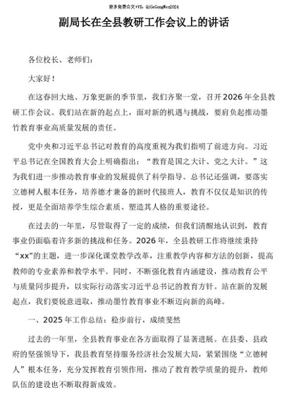 / 【七哥公文】2026年:副局长在全县教研工作会议上的讲话+更多免费公文+VX:QiGeGongWen2024