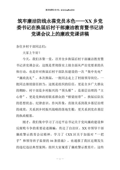 【七哥公文】2026年:筑牢廉洁防线永葆党员本色——XX乡党委书记在换届后村干部廉洁教育暨书记讲党课会议上的廉政党课讲稿+更多免费公文+VX:QiGeGongWen2024