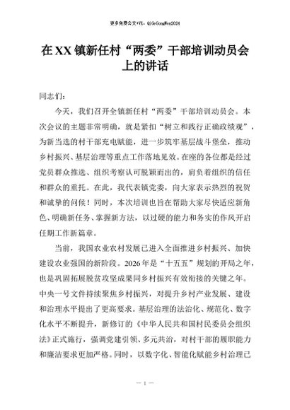 / 【七哥公文】2026年:在XX镇新任村“两委”干部培训动员会上的讲话+更多免费公文+VX:QiGeGongWen2024