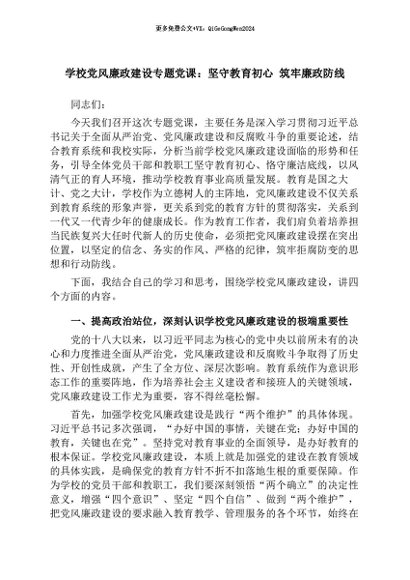 【七哥公文】2026年:学校党风廉政建设专题党课:坚守教育初心 筑牢廉政防线+更多免费公文+VX:QiGeGongWen2024