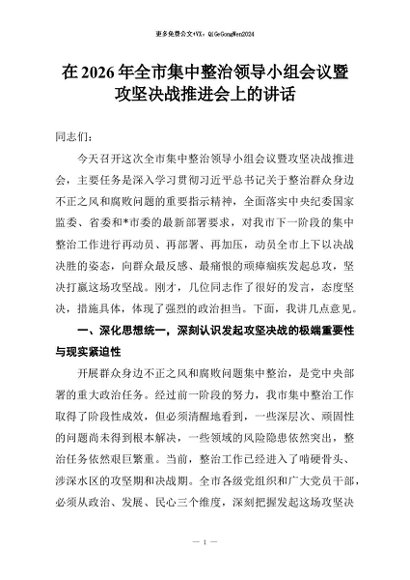 【七哥公文】2026年:在2026年全市集中整治领导小组会议暨攻坚决战推进会上的讲话+更多免费公文+VX:QiGeGongWen2024