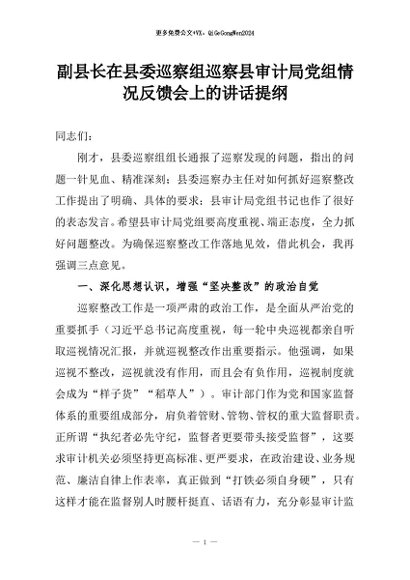 【七哥公文】2026年:副县长在县委巡察组巡察县审计局党组情况反馈会上的讲话提纲+更多免费公文+VX:QiGeGongWen2024