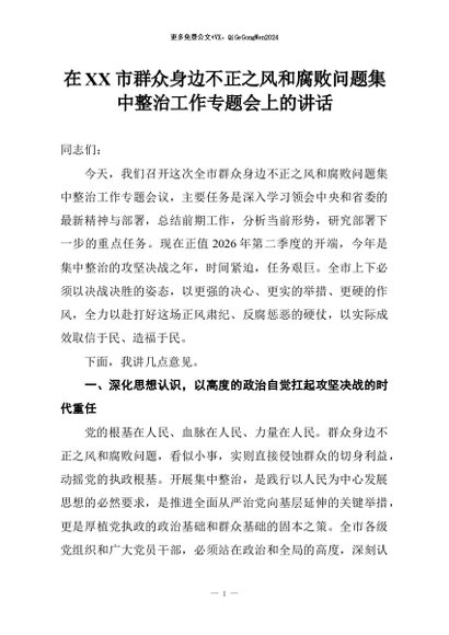 【七哥公文】2026年:在XX市群众身边不正之风和腐败问题集中整治工作专题会上的讲话+更多免费公文+VX:QiGeGongWen2024