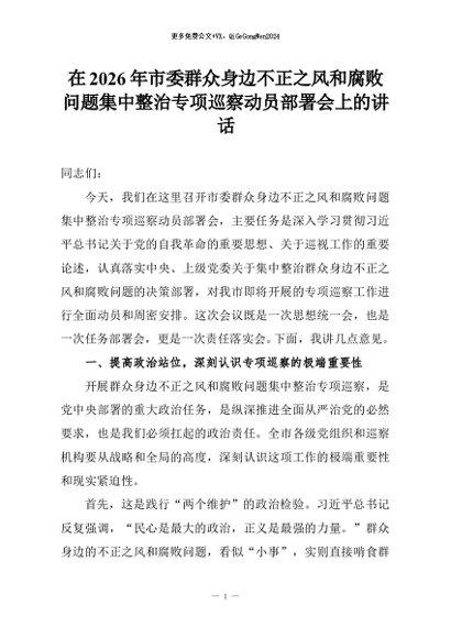 【七哥公文】2026年:在2026年市委群众身边不正之风和腐败问题集中整治专项巡察动员部署会上的讲话+更多免费公文+VX:QiGeGongWen2024