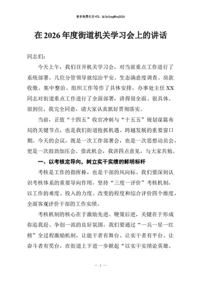 / 【七哥公文】2026年:在2026年度街道机关学习会上的讲话+更多免费公文+VX:QiGeGongWen2024