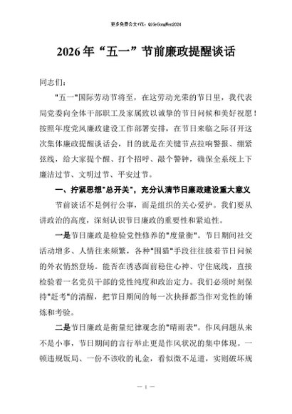 / 【七哥公文】2026年:2026年“五一”节前廉政提醒谈话+更多免费公文+VX:QiGeGongWen2024