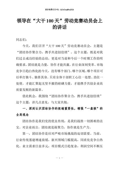 / 【七哥公文】2026年:领导在“大干100天”劳动竞赛动员会上的讲话+更多免费公文+VX:QiGeGongWen2024