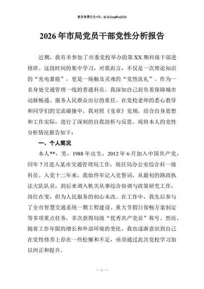 / 【七哥公文】2026年:2026年市局党员干部党性分析报告+更多免费公文+VX:QiGeGongWen2024