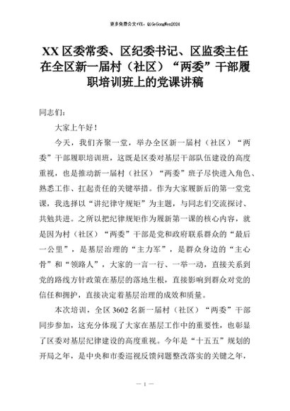 【七哥公文】2026年:XX区委常委、区纪委书记、区监委主任在全区新一届村(社区)“两委”干部履职培训班上的党课讲稿+更多免费公文+VX:QiGeGongWen2024