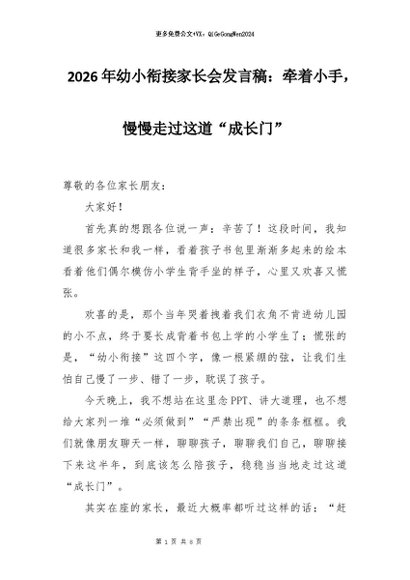 【七哥公文】2026年:2026年幼小衔接家长会发言稿:牵着小手,慢慢走过这道“成长门”+更多免费公文+VX:QiGeGongWen2024