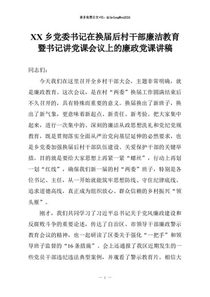 【七哥公文】2026年:XX乡党委书记在换届后村干部廉洁教育暨书记讲党课会议上的廉政党课讲稿+更多免费公文+VX:QiGeGongWen2024