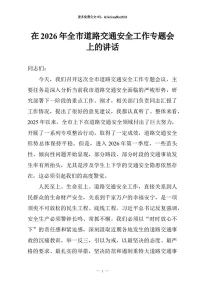 / 【七哥公文】2026年:在2026年全市道路交通安全工作专题会上的讲话+更多免费公文+VX:QiGeGongWen2024