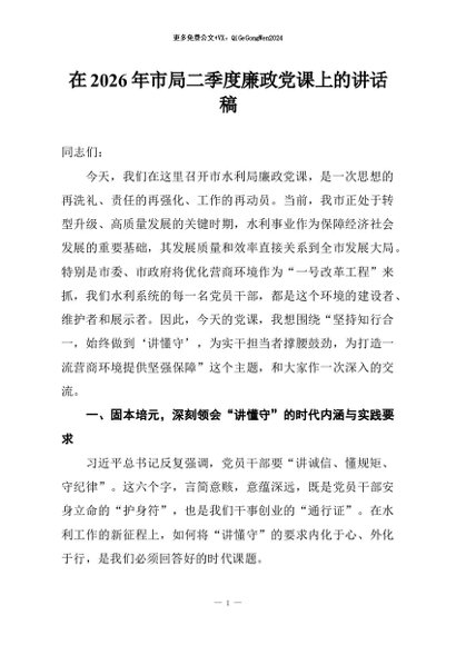 / 【七哥公文】2026年:在2026年市局二季度廉政党课上的讲话稿+更多免费公文+VX:QiGeGongWen2024