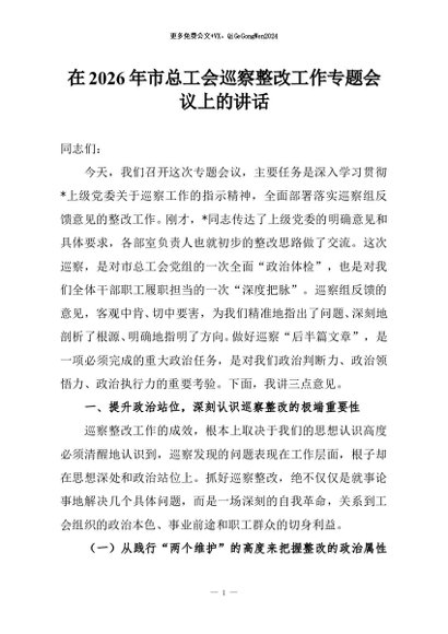 / 【七哥公文】2026年:在2026年市总工会巡察整改工作专题会议上的讲话+更多免费公文+VX:QiGeGongWen2024