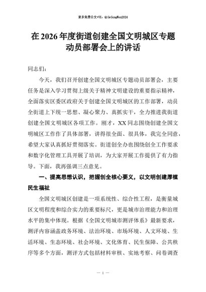 【七哥公文】2026年:在2026年度街道创建全国文明城区专题动员部署会上的讲话+更多免费公文+VX:QiGeGongWen2024