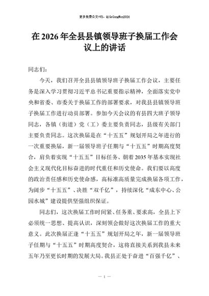 / 【七哥公文】2026年:在2026年全县县镇领导班子换届工作会议上的讲话+更多免费公文+VX:QiGeGongWen2024