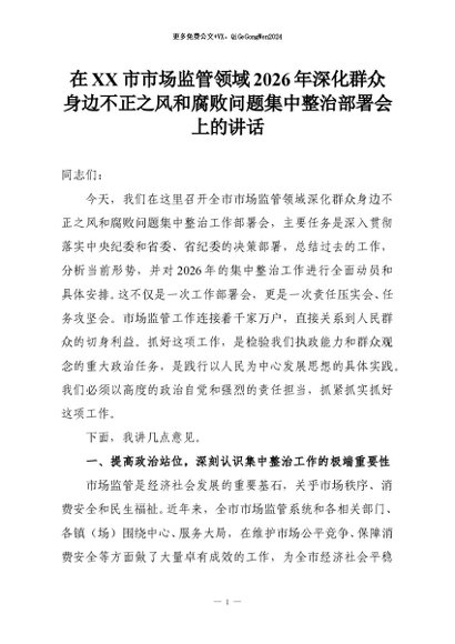 【七哥公文】2026年:在XX市市场监管领域2026年深化群众身边不正之风和腐败问题集中整治部署会上的讲话+更多免费公文+VX:QiGeGongWen2024