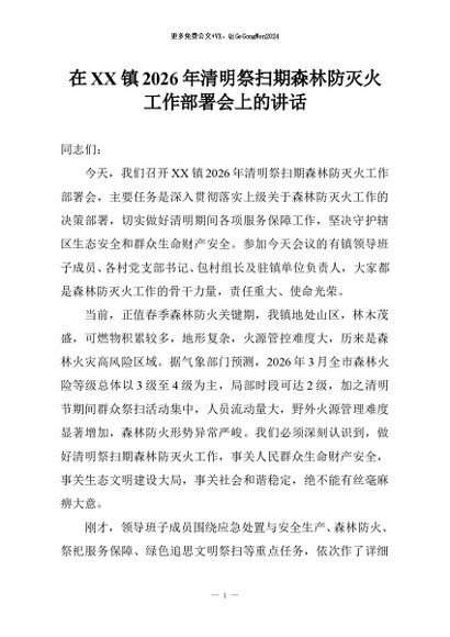【七哥公文】2026年:在XX镇2026年清明祭扫期森林防灭火工作部署会上的讲话+更多免费公文+VX:QiGeGongWen2024