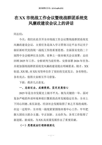 【七哥公文】2026年:在XX市统战工作会议暨统战群团系统党风廉政建设会议上的讲话+更多免费公文+VX:QiGeGongWen2024