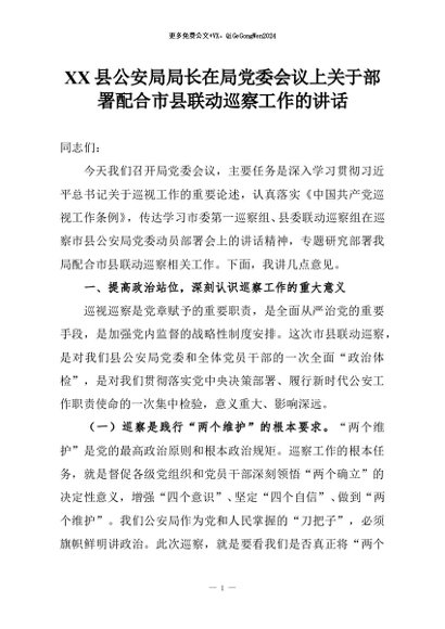 【七哥公文】2026年:XX县公安局局长在局党委会议上关于部署配合市县联动巡察工作的讲话+更多免费公文+VX:QiGeGongWen2024