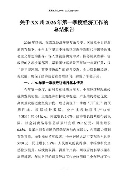 / 【七哥公文】2026年:关于XX州2026年第一季度经济工作的总结报告+更多免费公文+VX:QiGeGongWen2024