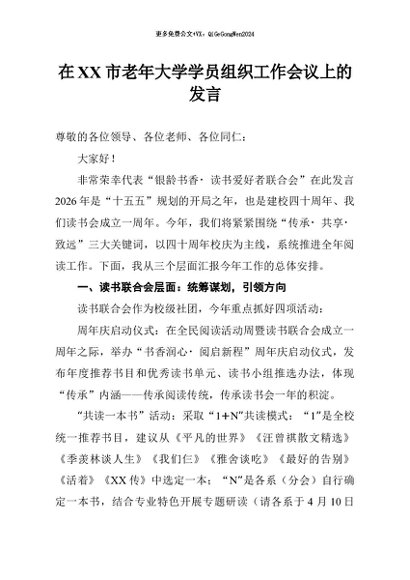 / 【七哥公文】2026年:在市老年大学学员组织工作会议上的发言+更多免费公文+VX:QiGeGongWen2024