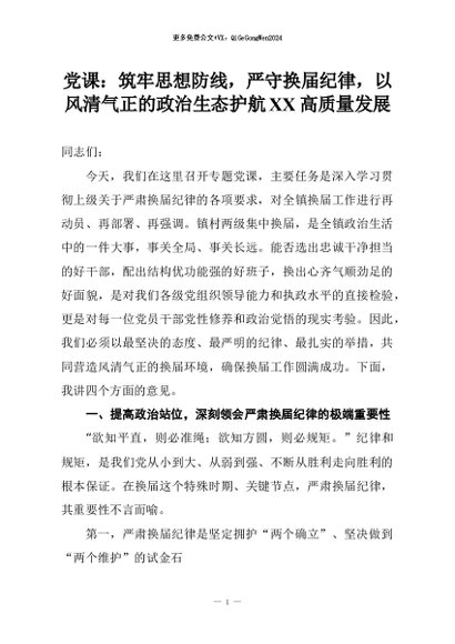 【七哥公文】2026年:党课:筑牢思想防线,严守换届纪律,以风清气正的政治生态护航XX高质量发展+更多免费公文+VX:QiGeGongWen2024