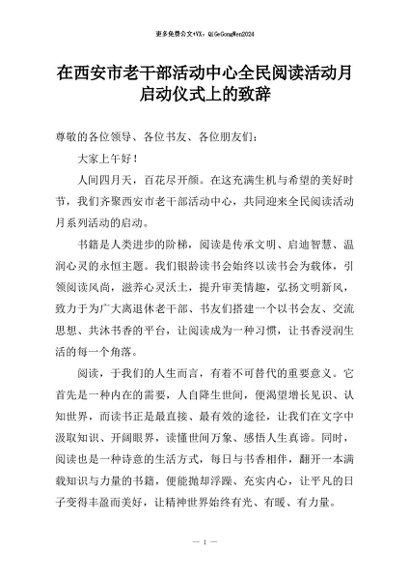 【七哥公文】2026年:在西安市老干部活动中心全民阅读活动月启动仪式上的致辞+更多免费公文+VX:QiGeGongWen2024