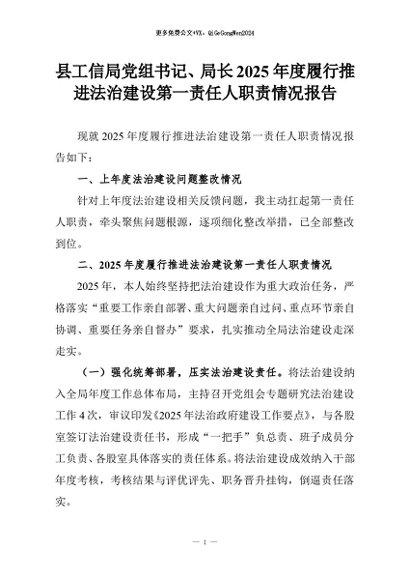 【七哥公文】2026年:县工信局党组书记、局长2025年度履行推进法治建设第一责任人职责情况报告+更多免费公文+VX:QiGeGongWen2024