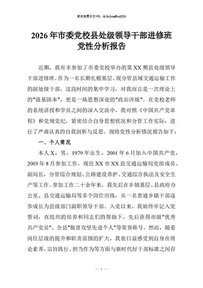 【七哥公文】2026年:2026年市委党校县处级领导干部进修班党性分析报告+更多免费公文+VX:QiGeGongWen2024