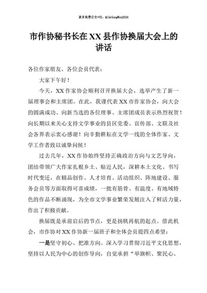 / 【七哥公文】2026年:市作协秘书长在县作协换届大会上的讲话+更多免费公文+VX:QiGeGongWen2024