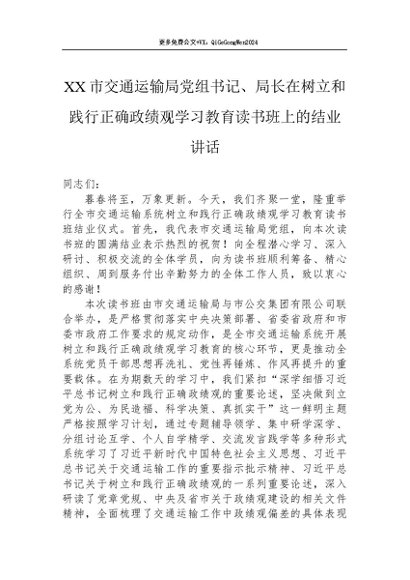 【七哥公文】2026年:市交通运输局党组书记、局长在树立和践行正确学习教育读书班上的结业讲话+更多免费公文+VX:QiGeGongWen2024