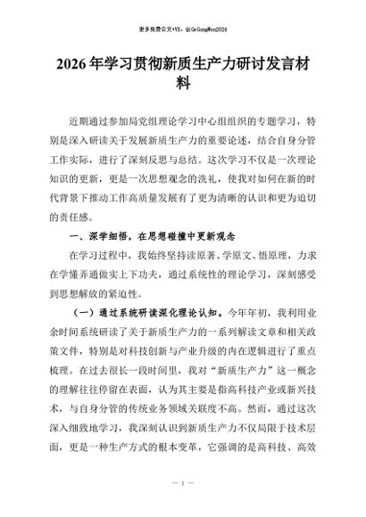 【七哥公文】2026年:2026年学习贯彻新质生产力研讨发言材料+更多免费公文+VX:QiGeGongWen2024