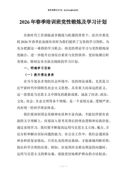 【七哥公文】2026年:2026年春季培训班党性锻炼及学习计划+更多免费公文+VX:QiGeGongWen2024