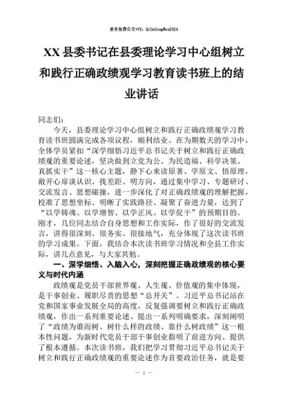 【七哥公文】2026年:县委书记在县委理论学习中心组树立和践行正确学习教育读书班上的结业讲话+更多免费公文+VX:QiGeGongWen2024