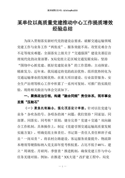 / 【七哥公文】2026年:单位以高质量党建推动中心工作提质增效经验总结+更多免费公文+VX:QiGeGongWen2024