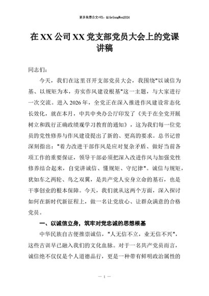 / 【七哥公文】2026年:在XX公司XX党支部党员大会上的党课讲稿+更多免费公文+VX:QiGeGongWen2024