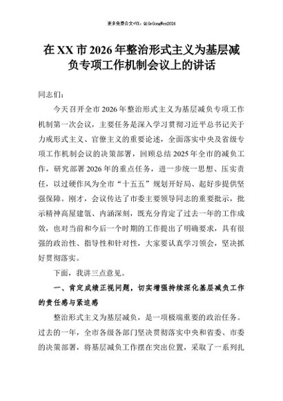 【七哥公文】2026年:在市2026年整治形式主义为基层减负专项工作机制会议上的讲话+更多免费公文+VX:QiGeGongWen2024