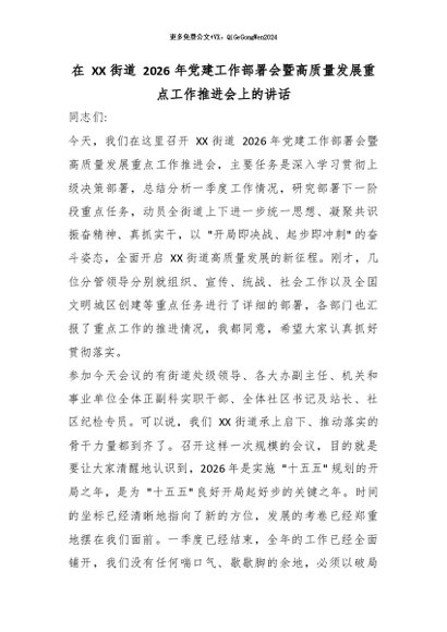 【七哥公文】2026年:在 XX 街道 2026 年党建工作部署会暨高质量发展重点工作推进会上的讲话_副本+更多免费公文+VX:QiGeGongWen2024
