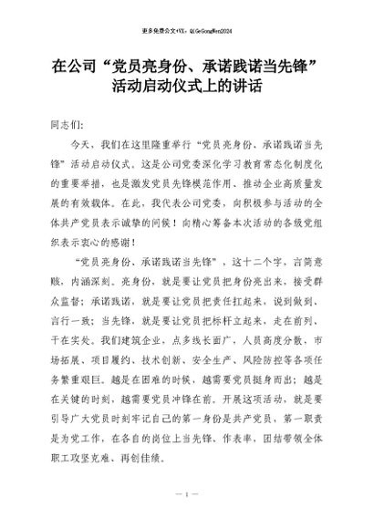【七哥公文】2026年:在公司“党员亮身份、承诺践诺当先锋”活动启动仪式上的讲话+更多免费公文+VX:QiGeGongWen2024